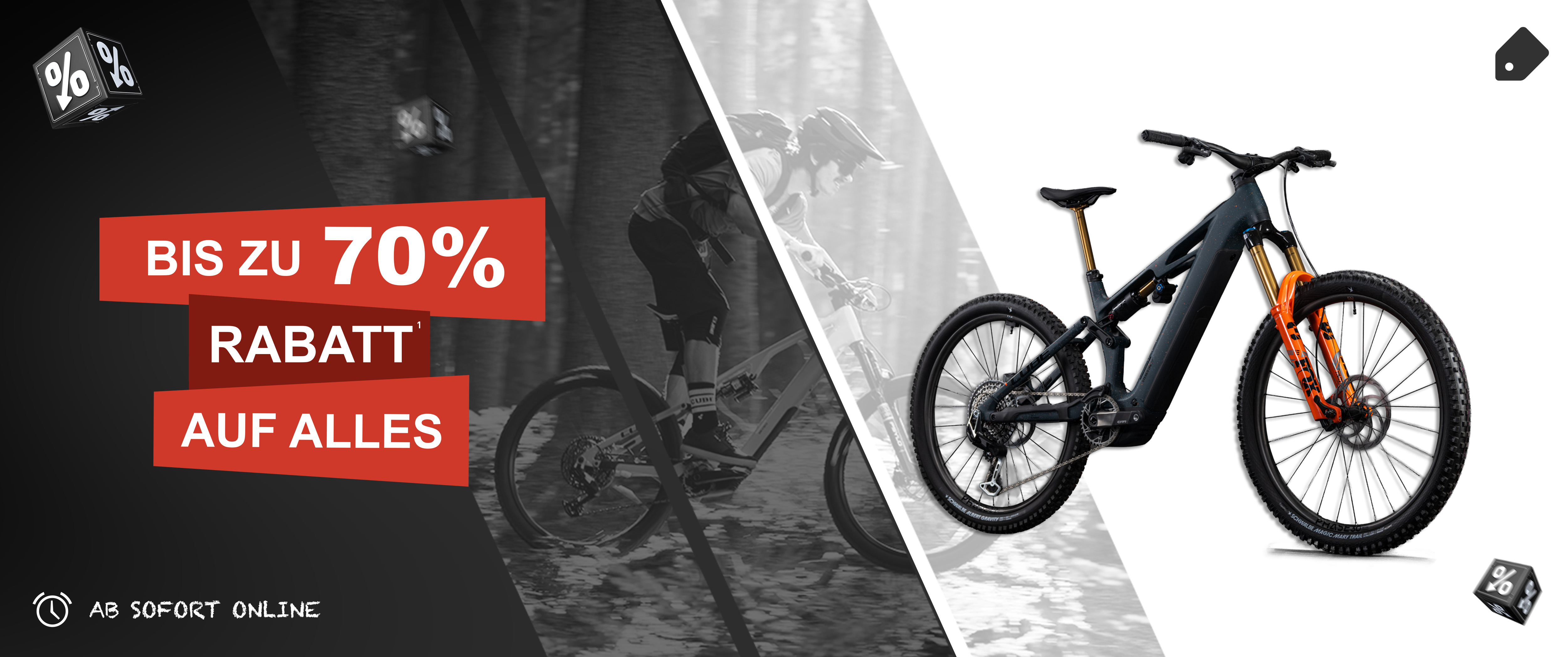 1 - Bis zu 70% Rabatt gibt es auf einzelne Zubehör & Kleidungsartikel, bis zu 55% auf eBikes & Bikes. Nur solange der Vorrat reicht, Tippfehler & Irrtümer vorbehalten. Rabatte werden immer im Verhältnis zur UVP berechnet. Aktion gültig bis 29.11.2025